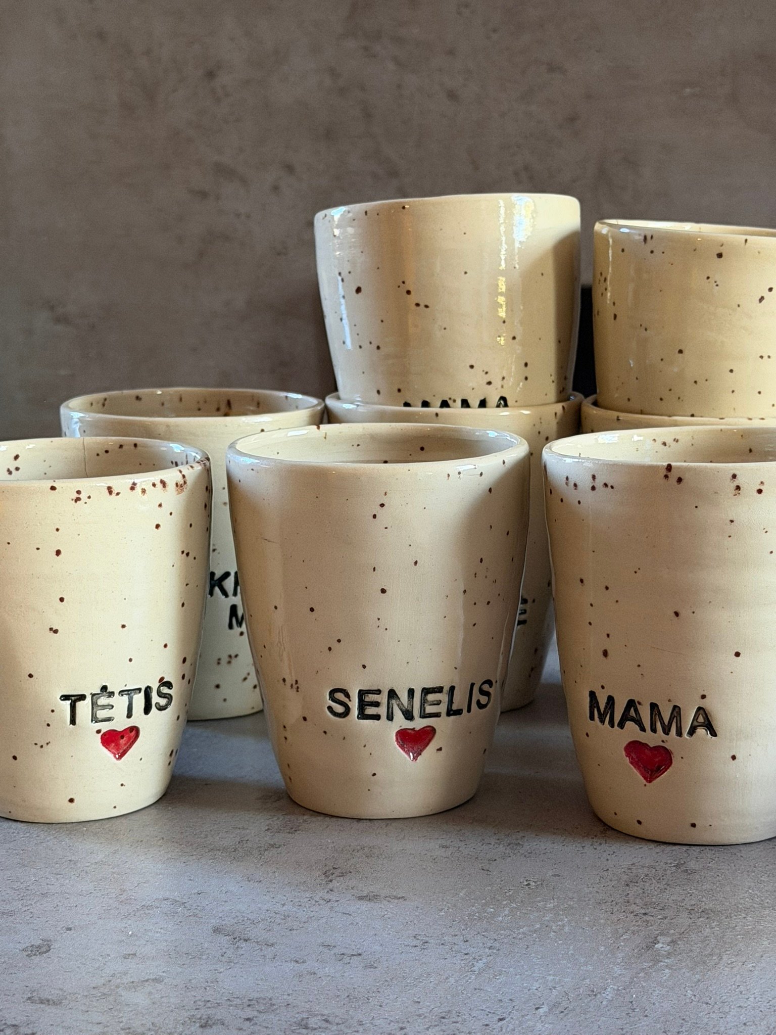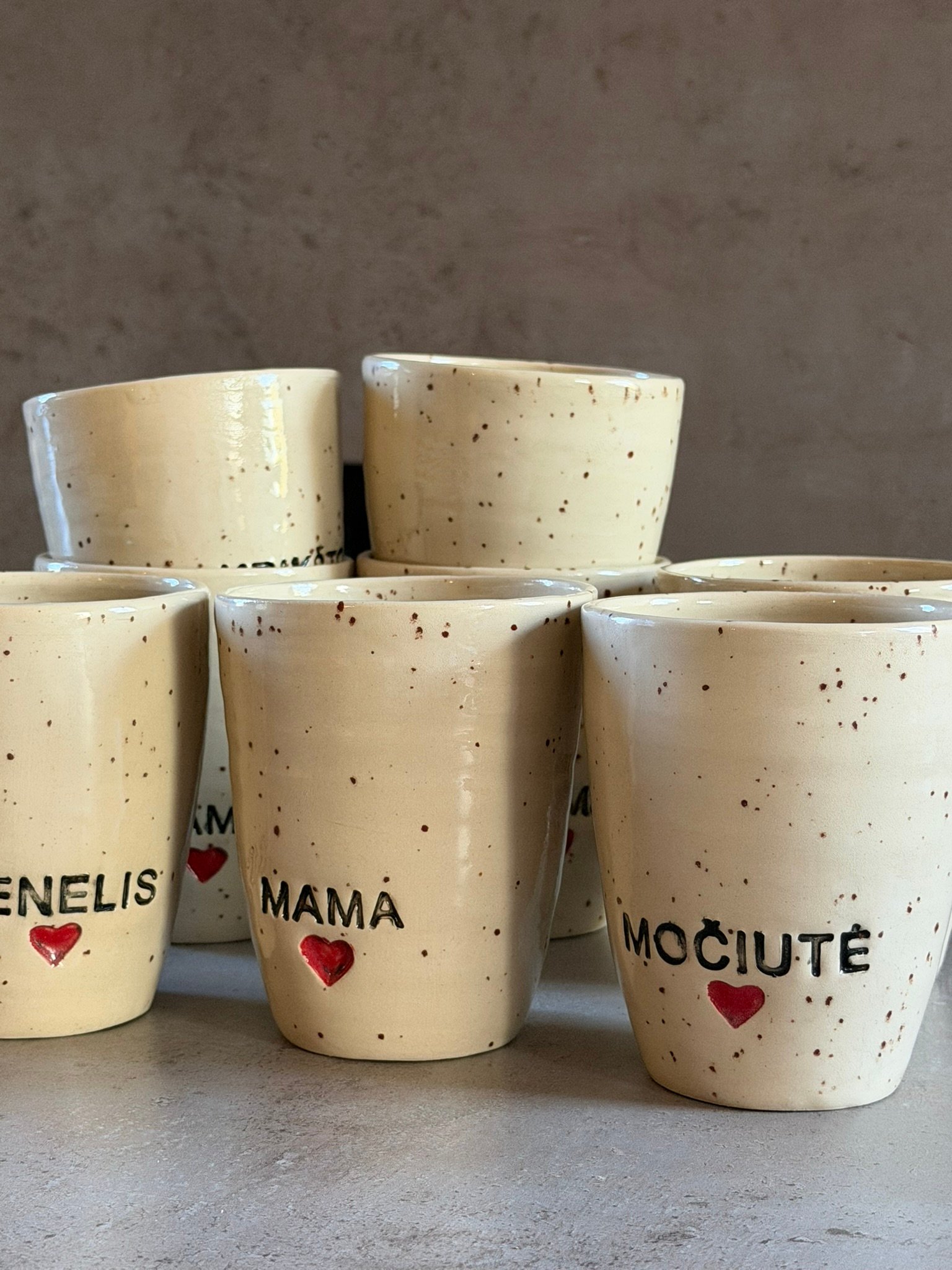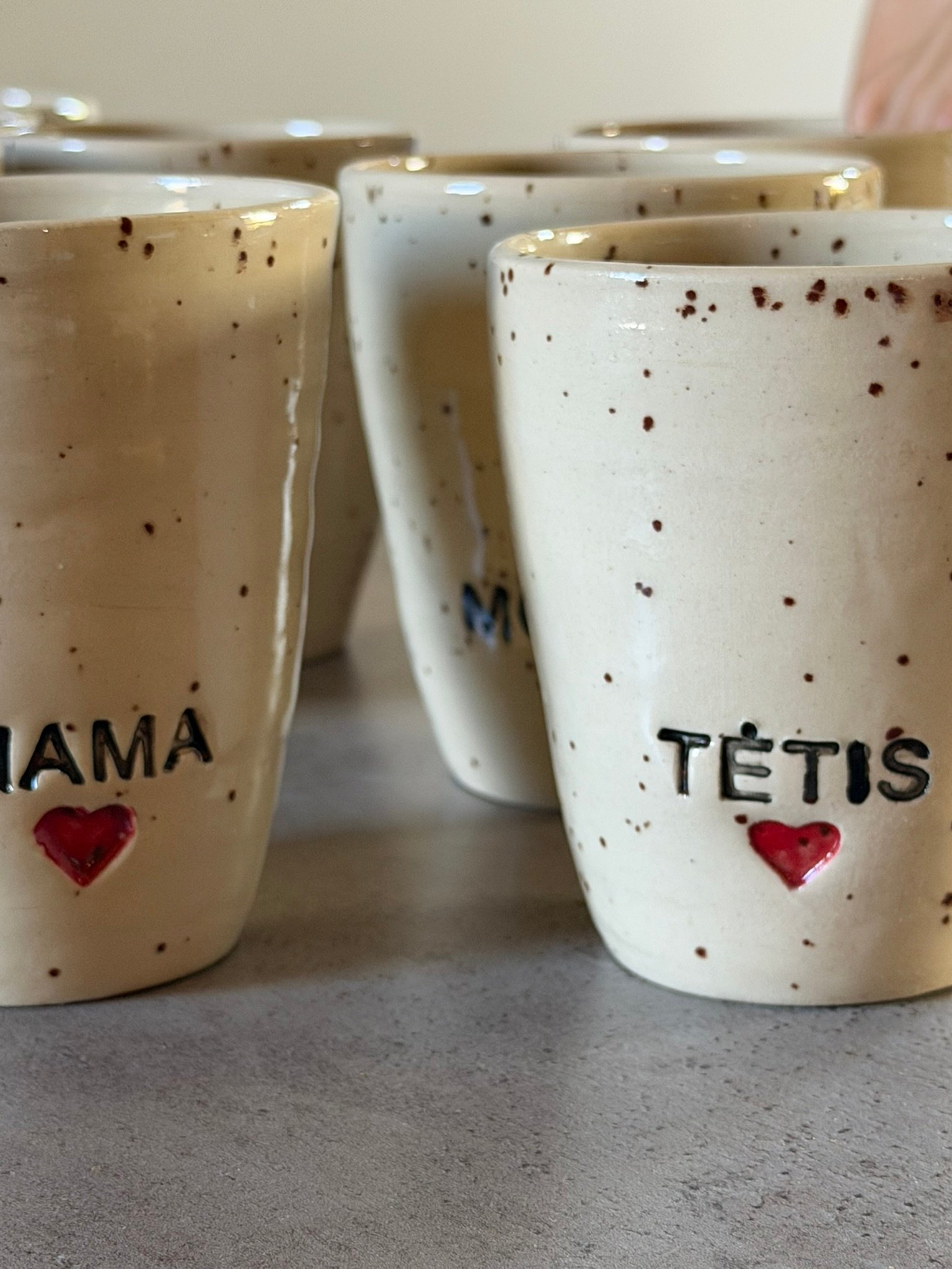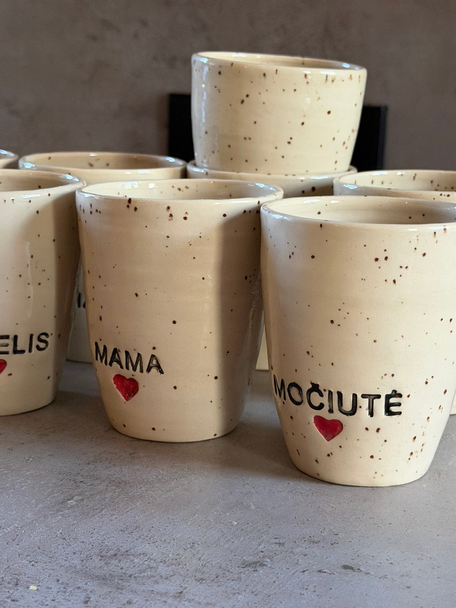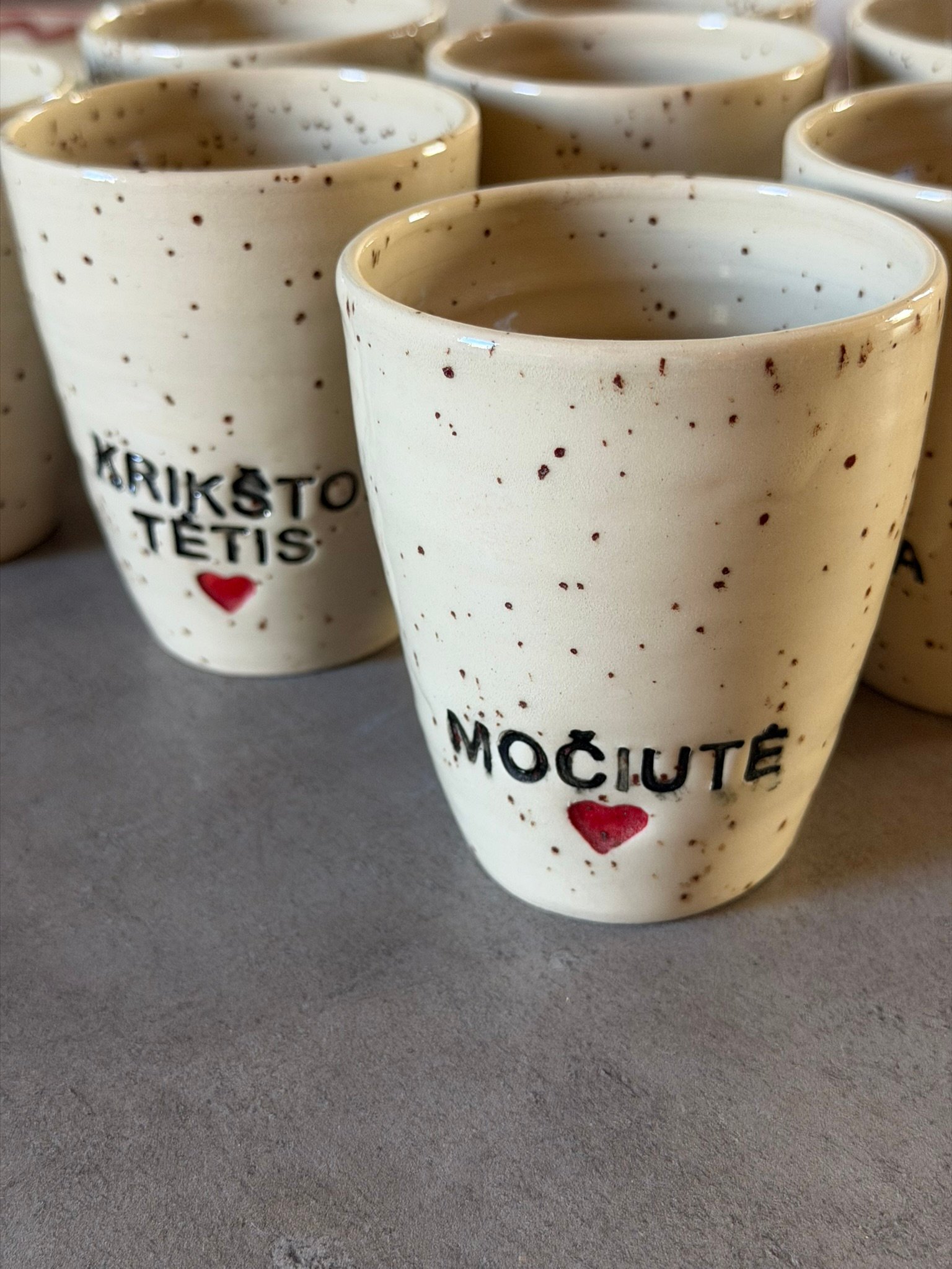 Keramikiniai rankų darbo puodeliai su užrašais. Puodeliai gaminami, užrašai spaudžiami rankomis, todėl raidės gali būti su minimaliais aukščio neatitikimais. Viskas gaminama Lietuvoje :)